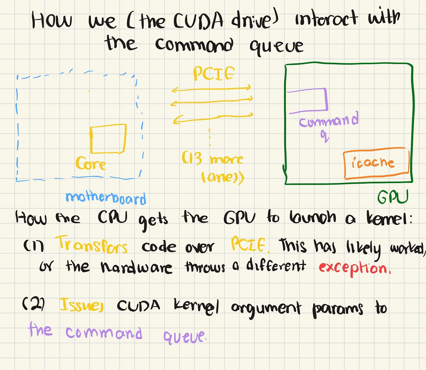 Once the GPU has a place to find all the code to run, the CUDA driver sets up a packet to be shared through PCIE with data like: