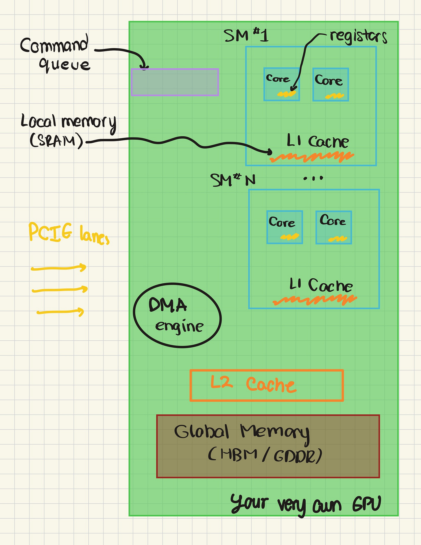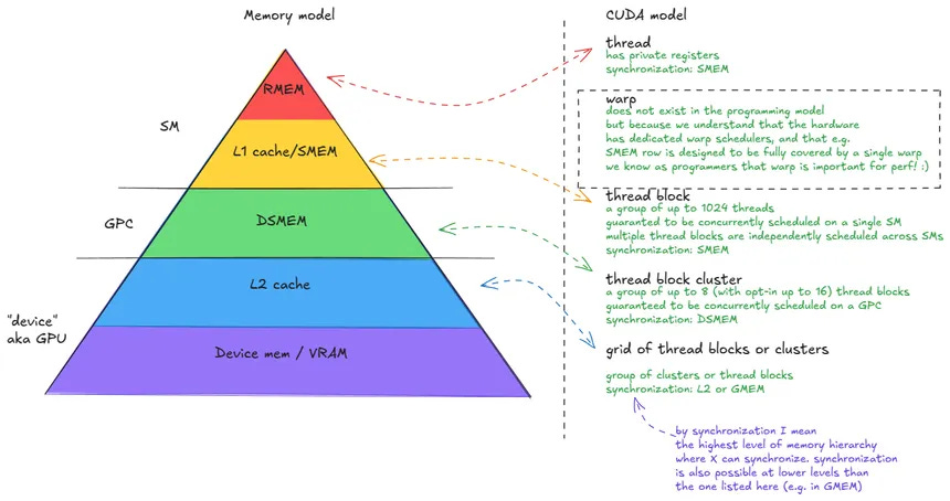 First, we need to understand a critical part of designing high performance kernels – the memory hierarchy of GPUs. The picture I’ve made above captures the absolutely necessary 60-70% of that, and for those interested in the full incarnation of memory, see this picture I sniped from Aleksa Gordic’s amazing blog on the same topic.