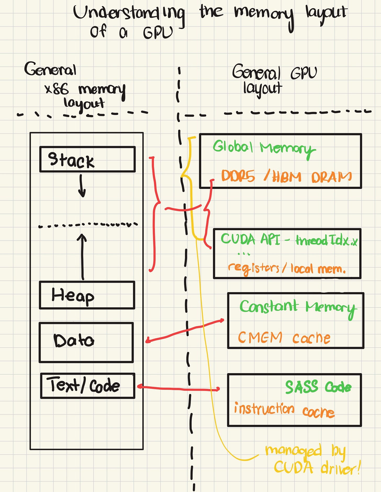 If you’ve taken a college course on computer architecture, you may have briefly glanced over GPUs. And after some point of taking operating systems or your first low-levels course, you may have thought about an tricky little question — why didn’t I ever hear about stacks, heaps, and data for GPUs? While I don’t have the complete answer to that, I’ll try to unearth some of the basic differences between CPU-backed virtual memory abstractions and the abstractions for a GPU.