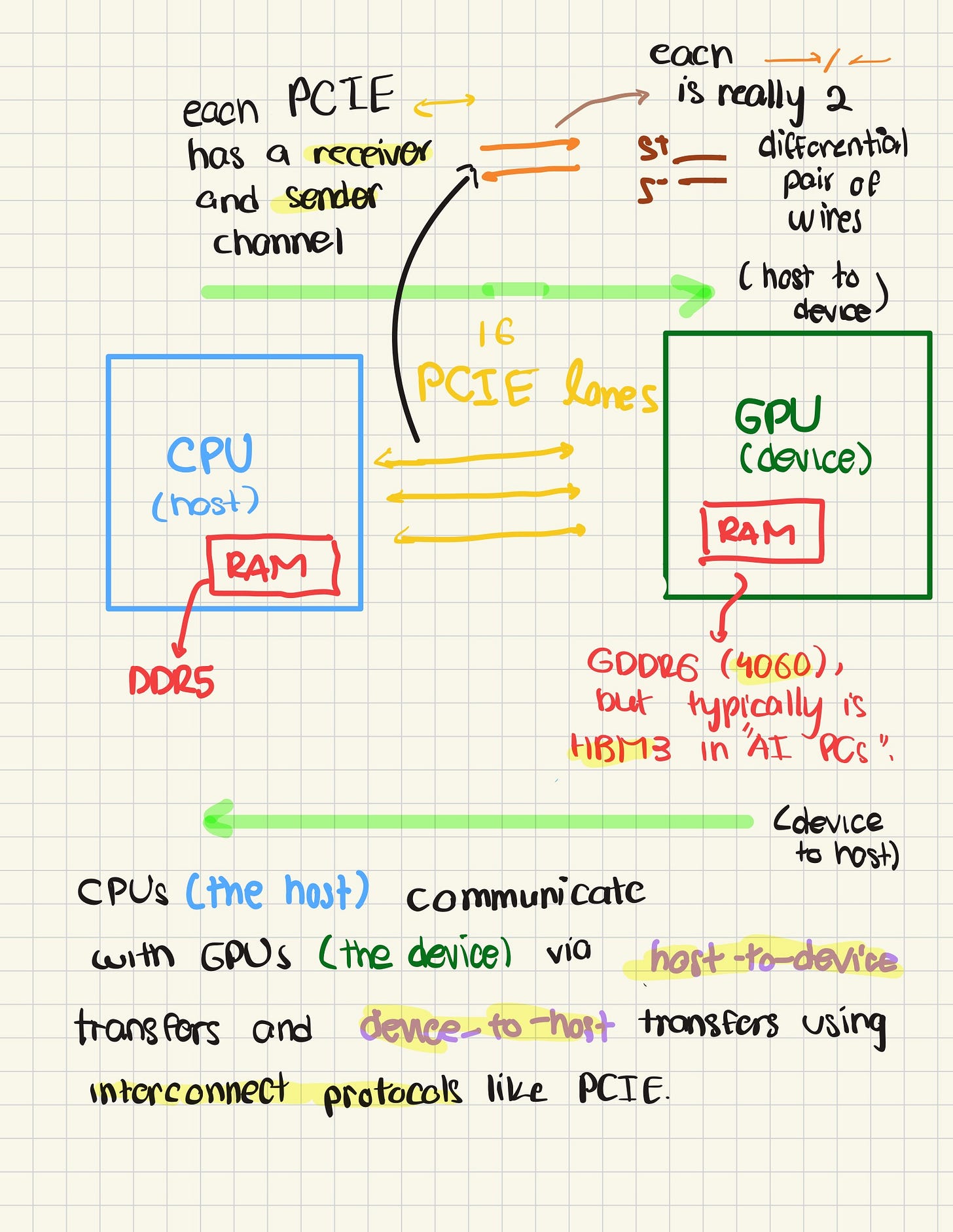 After the compilation step, you have a binary that strikingly resembles a binary that you’d typically run in C or C++. But, here’s the first challenge - you (i.e, your CPU), the host, need to run this binary on a completely different hardware (the GPU), termed the peripheral device in hardware lingo. How do we do this? To maximize data transfer speeds, we literally connect the GPU to the CPU, either through soldered lines, or wires with some hardware logic controlling this “bridge”, typically termed an interconnect. Enter Peripheral Component Interconnect Express (PCIE).