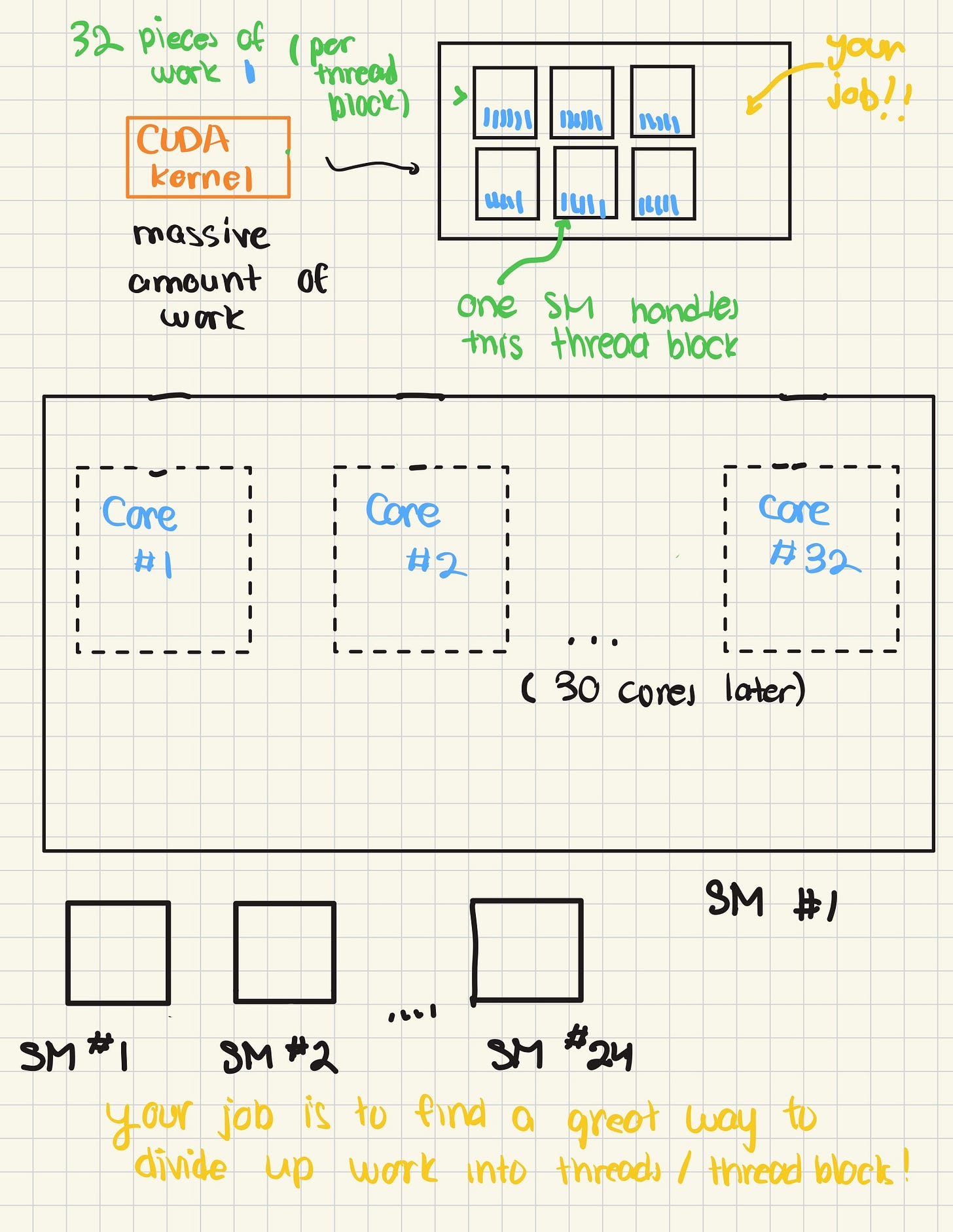 The problem can feel incredibly scary at first, but the secret is to lean in on nice abstractions that CUDA has provided you with when creating threads and blocks. Let’s build this step by step, and introduce thread and block concepts as they’re needed.