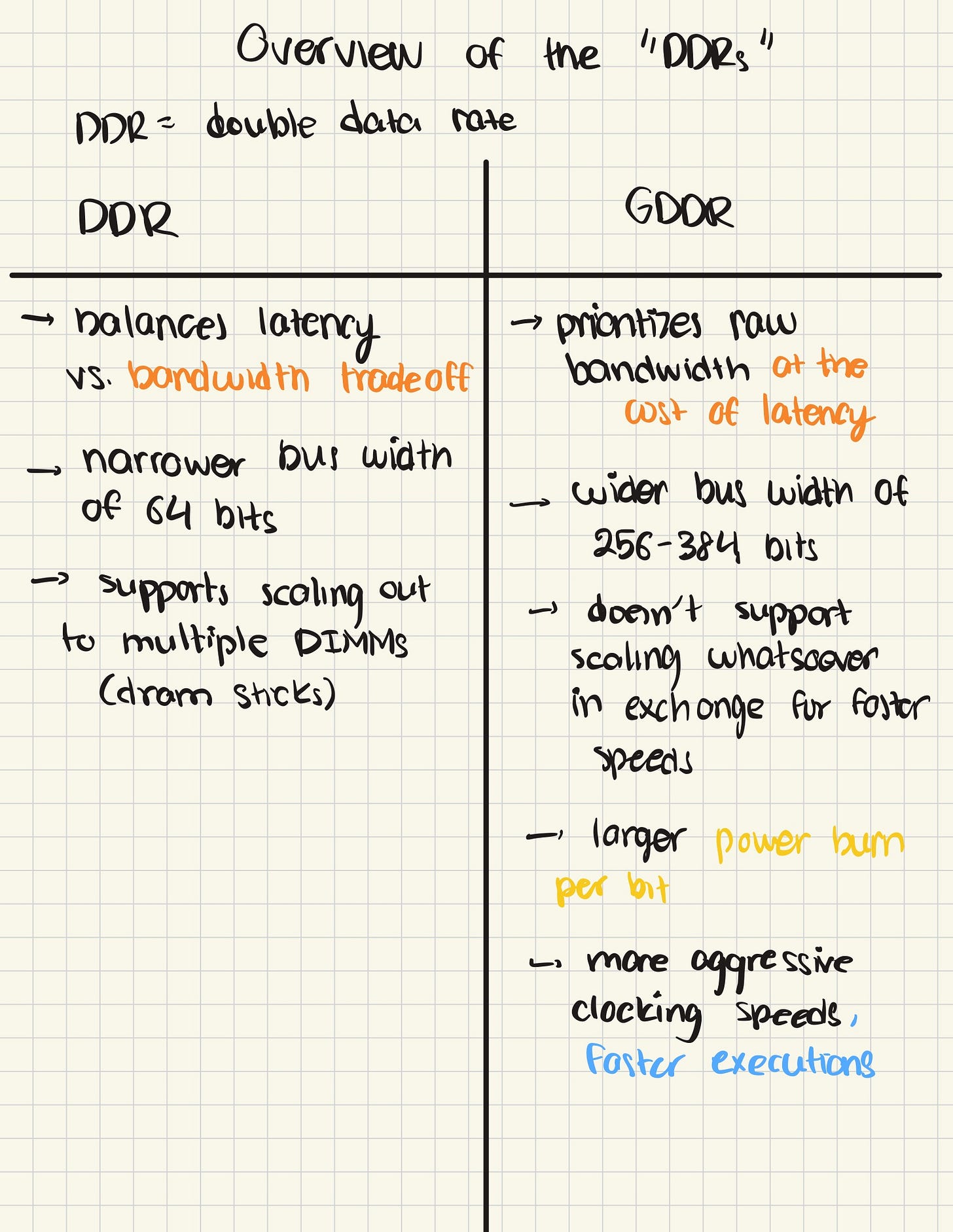 Hopefully this makes it easier to gauge memory performance. Now, back to DDR vs GDDR. DDR is primarily designed for hardware like cores and CPUs. GDDR, or Graphics Double Data Rate extends this concept to GPUs.