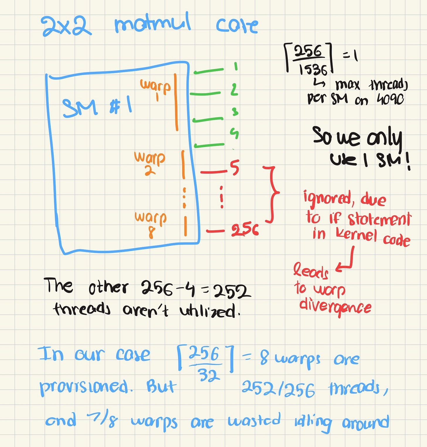 warp_id = flat_id / 32Warps give us a finer granularity to also think about inefficiencies. Remember that tiling inefficiency? We can quantify it more precisely. In reality, each 256 thread thread block we create leads to 256 threads / 32 threads per warps = 8 warps being run. And since 7 out of 8 warps are idling, we’ve burned over 80% of the compute we’ve scheduled.