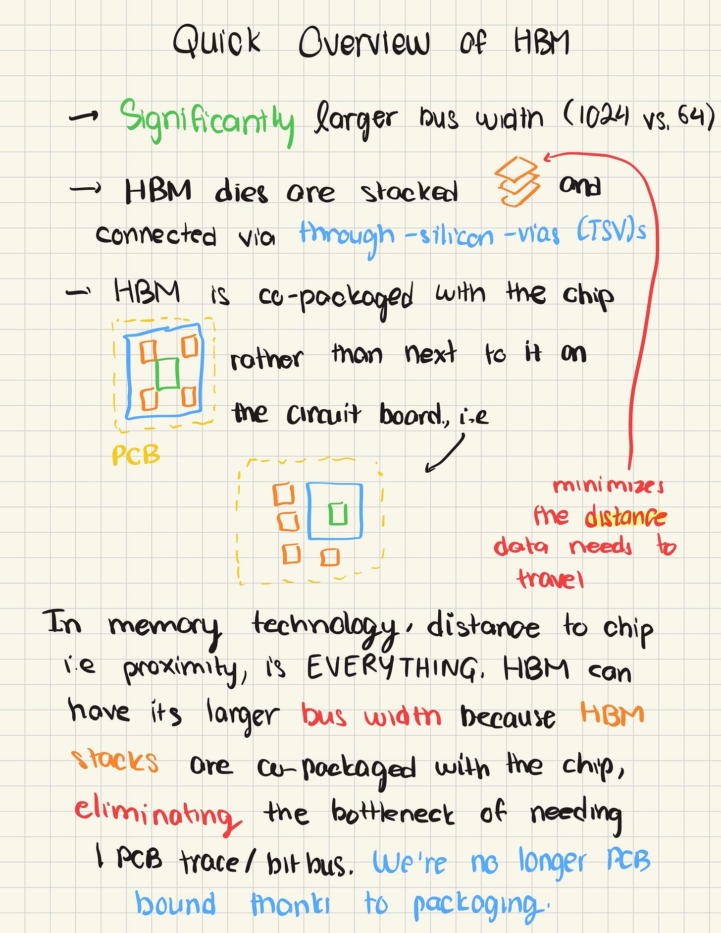 Can we do better? The answer turns out to be yes! GDDR and DDR both have to be externally connected to the chip on a PCB, fundamentally limiting their bus width. Enter HBM, which uses novel packing techniques to cut out this limitation.