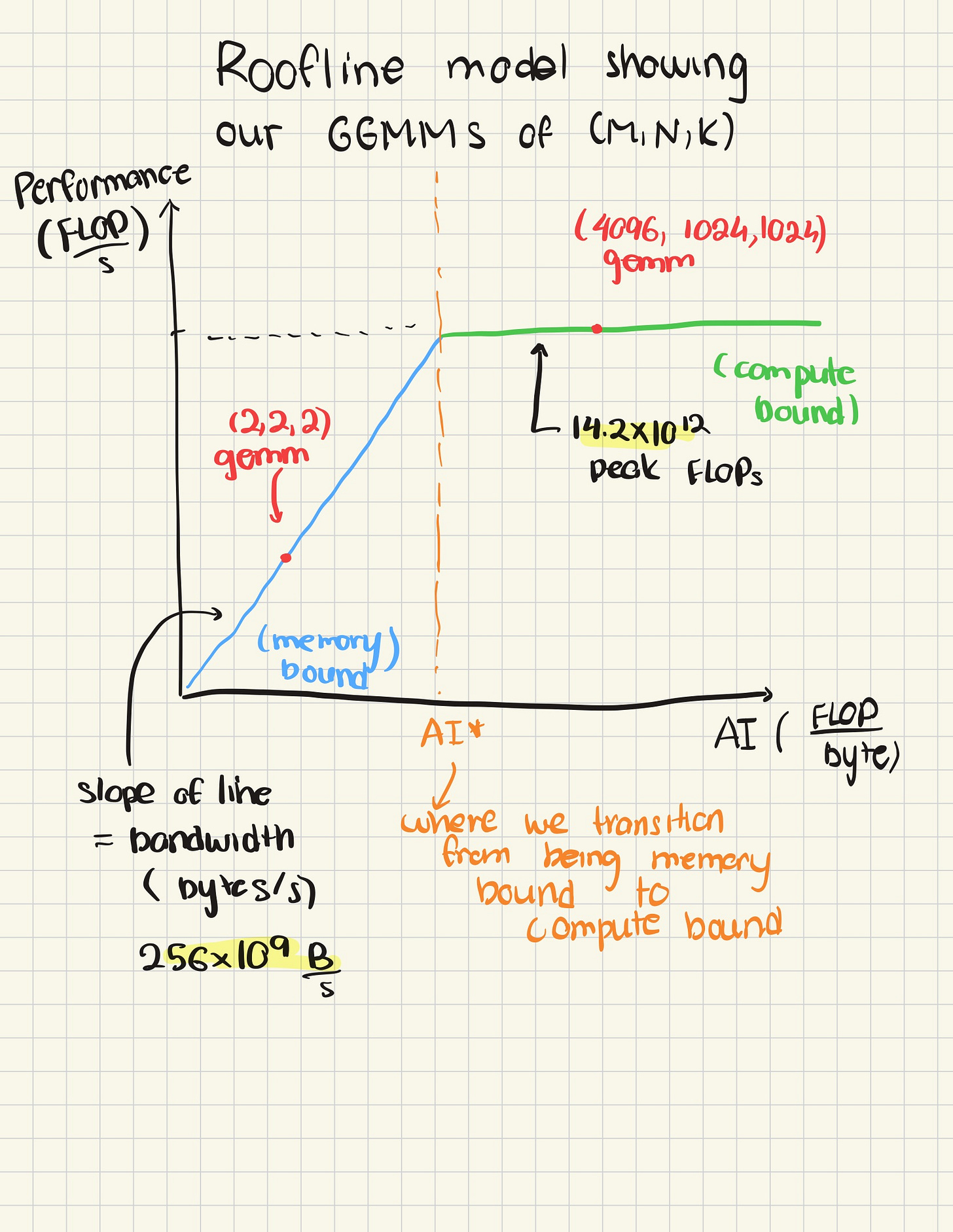 We wish to figure out whether running our General Matrix Multiplication (termed GEMM in industry) workload is either theoretically bound by memory, or compute. Let’s do that!