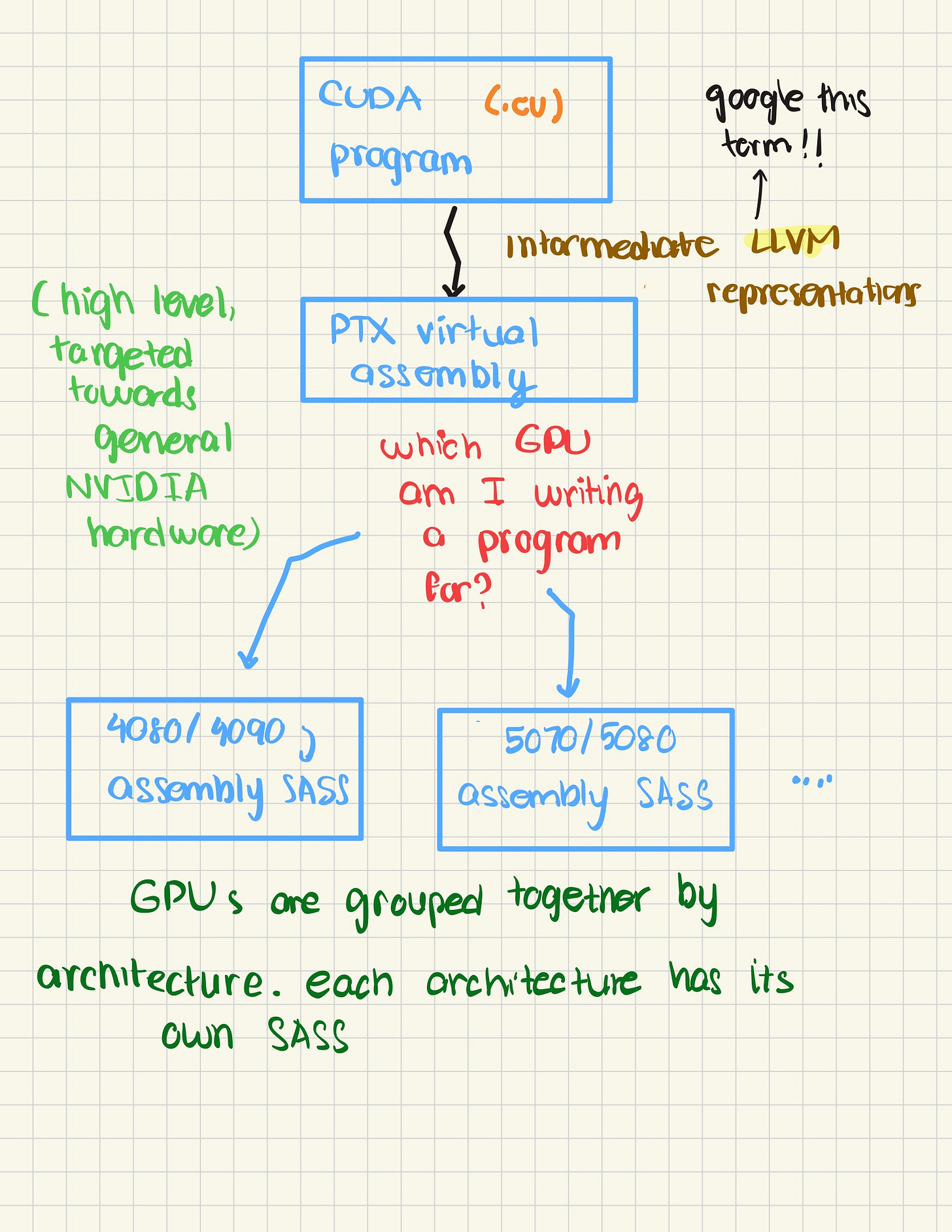 Like all code, we need to find a way to turn our human readable code into something that the GPU can understand? What does this call for? A compiler! NVIDIA’s CUDA software toolkit introduces nvcc, a compiler that takes programs written in CUDA, something that resembles C/C++ in syntax, and outputs assembly instructions that the GPU can run. But, nvcc is different from the compilers you might encounter. nvcc compiles CUDA files and transforms them into SASS.