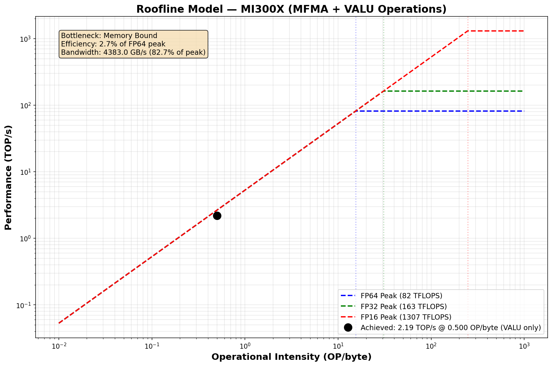 My day-to-day activities have compelled me to delve deeper into kernels programmed via HIP (ROCm’s equivalent of the CUDA programming language). And just like popcorn, we can say that GPU kernels have different flavors. I’ll opt to flavorize them purely based on arithmetic intensity, which is traditionally defined as the ratio between floating point operations (FLOP) and bytes loaded by a GPU kernel. From there, we can find the ridge point of the MI300X after a couple of quick datasheet lookups.