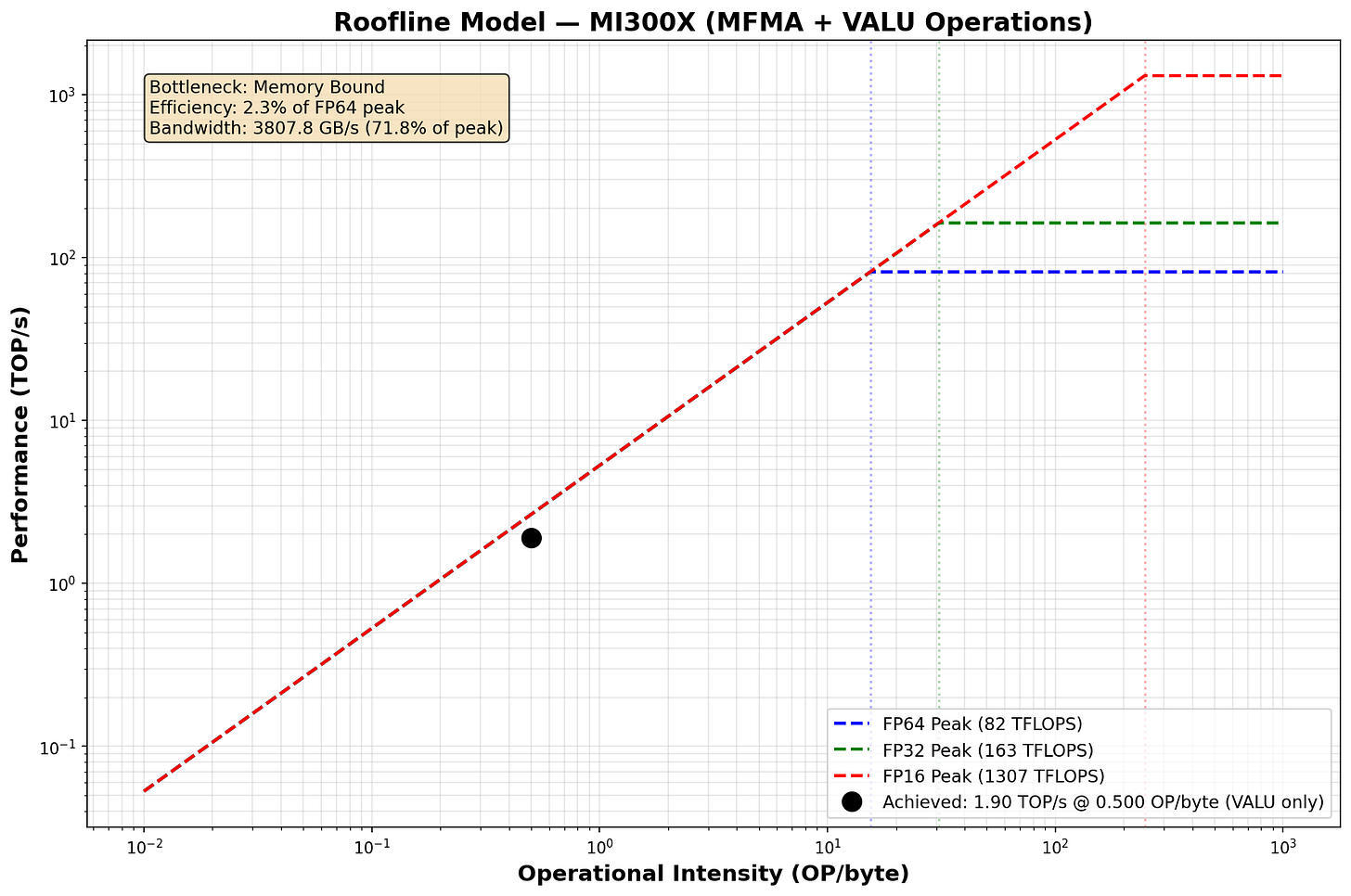 In the memory bound regime, our FLOPs are bound by how fast our memory subsystem can fetch data. Unfortunately, we often do NOT get the full 5.3 TB/s that AMD lists on their data sheet in practice, so our performance is worse than the latency you’d expect purely from loading data (I’m making the “roofline assumption” that our kernel runtime can be approximated as the max of either purely memory, and compute; memory in this case).